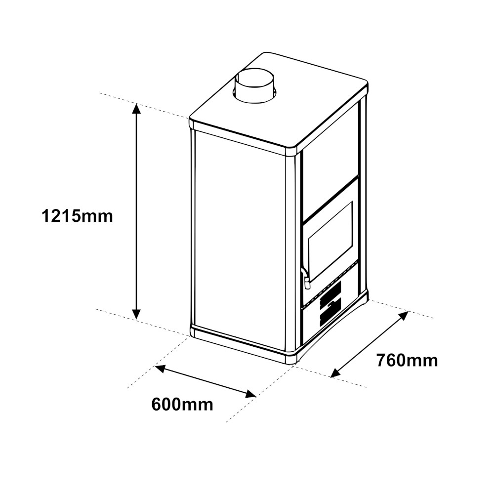 La stufa ha un’ampia struttura, larga 78 cm, alta 100 cm, mentre il vano camino ha dimensioni 600x420x440 mm.