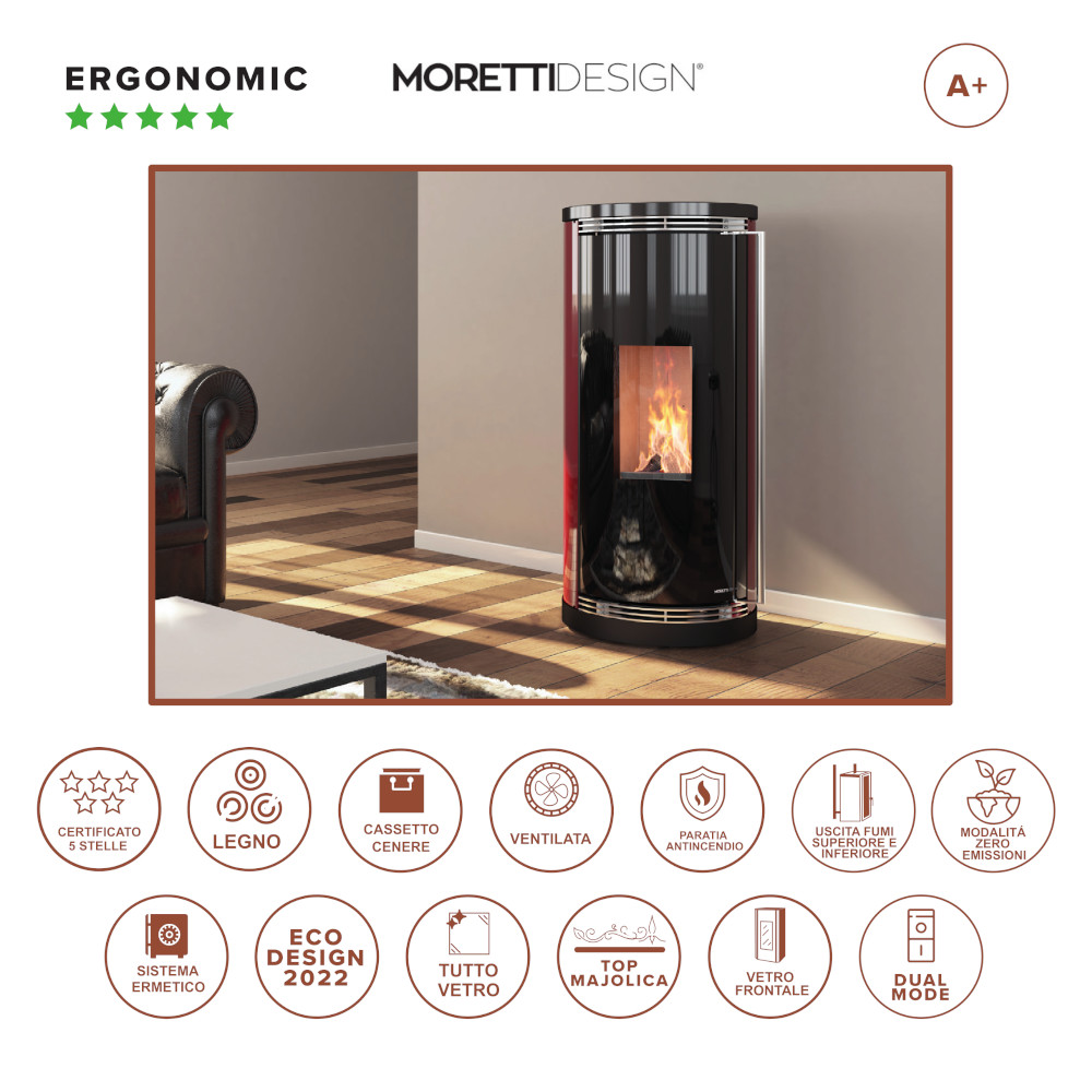 Il design della stufa Wood Ergonomic è frutto dello studio di artigiani professionisti che realizzano con passione un prodotto simbolo dell’eleganza Made in Italy.  La porta del sistema è tutta vetro temperato, quindi resistente alle alte temperature. Il vetro è plasmato con una speciale mescola hi-tech che lo rende totalmente oscurato, impedendo la visione della camera di combustione, solo quando quest’ultima è sprovvista di fiamma, quindi a stufa spenta. La doppia porta e il sistema ermetico, garantiscono sicurezza e maggiore protezione. E’ fornita di un maniglione in acciaio inox che rende il sistema pratico e funzionale. La stufa Ergonomic è dotata di un ventilatore per la produzione di aria calda, che può essere regolato e consente di gestire la distribuzione del calore. Con l’interruttore, chiamato commutatore, è possibile regolare la velocità del ventilatore scegliendo tra due potenze differenti. Inoltre, il sistema ermetico di Moretti Design permette di utilizzare tutta l’aria di combustione della stufa dall’esterno dell’abitazione. Il top è realizzato in maiolica di colore bianco.