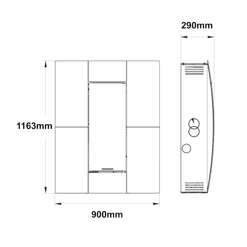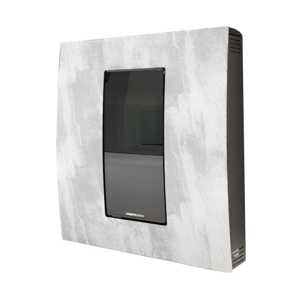 La sua forma quadrata e compatta, con uno spessore di appena 29cm, consente un’installazione a filo parete, per un risultato elegante e minimalista. Il frontale impreziosito da un vetro curvo color Stone si integra armoniosamente in vari stili di arredamento. Durante il funzionamento, la fiamma visibile attraverso il vetro si anima, creando un’atmosfera calda e accogliente. Grazie alla presenza di un doppio vetro, si ottiene un migliore isolamento termico, maggiore sicurezza, protezione. Nel modello Compact Glass10kW Stone, le ventole sono disattivabili, questo consente la fuoriuscita di aria calda rendendo la stufa silenziosa, poichè il riscaldamento avviene per convezione naturale. La cornice laterale in acciaio nero facilita la pulizia della superficie, che può essere facilmente igienizzata con un panno umido.  L’uscita dei fumi, situata sulla parte posteriore e laterale, ha un diametro di 80 mm.