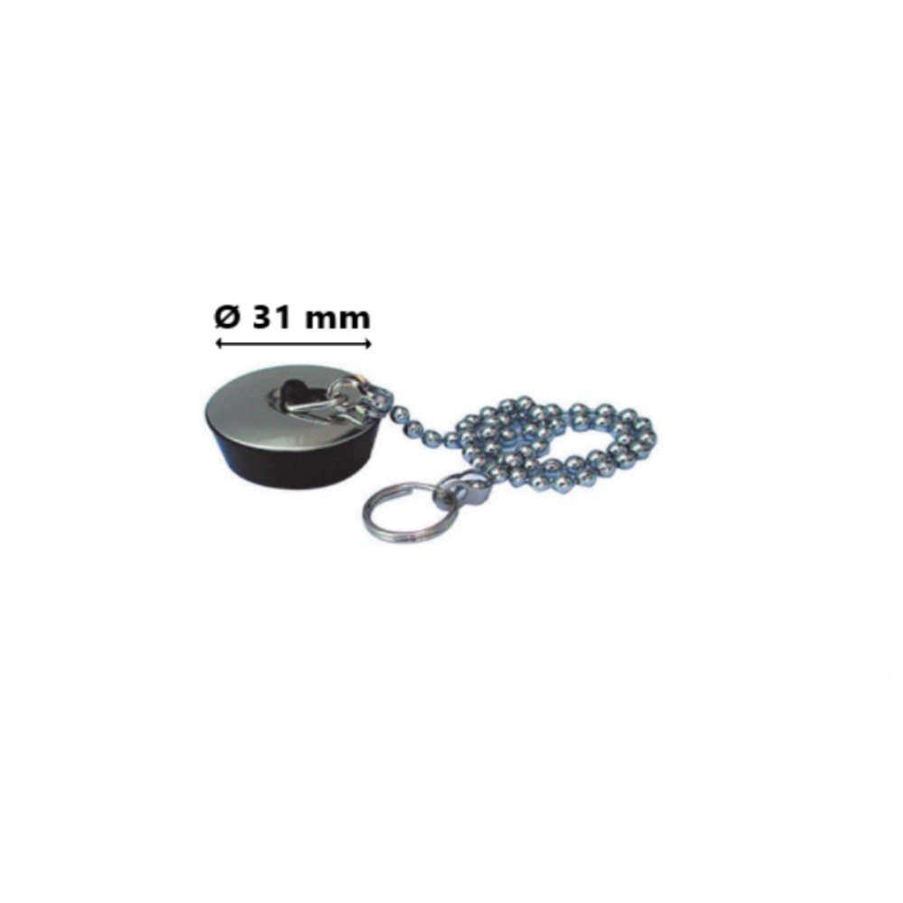 Tappo in gomma nera con rosetta inox e catena lunga 30 cm a perline cromate. Ideale per lavello da cucina, per il bagno e tanto altro. Disponibile in varie misure. Nello specifico questo ha Ø esterno 31 mm.