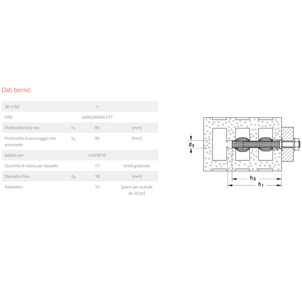 Il tassello a calza gialla è l’ideale per il fissaggio su supporti forati. La maglia della calza garantisce un perfetto riempimento dei vuoti evitando la fuoriuscita di resina. L’iniezione della resina dal beccuccio miscelatore delle cartucce bicomponenti è agevolato dalla presenza dell’adattatore. I 4 fori presenti sulla testa del tassello a calza sono veri e propri fori spia e danno l’idea dello stato di riempimento della calza. Appena la resina fuoriesce da questi fori “troppo pieno” non è più necessario introdurre resina. Ø foro 18 mm. Adatto per Ø 10/M10. Quantità di resina per tassello 18 unità graduate.