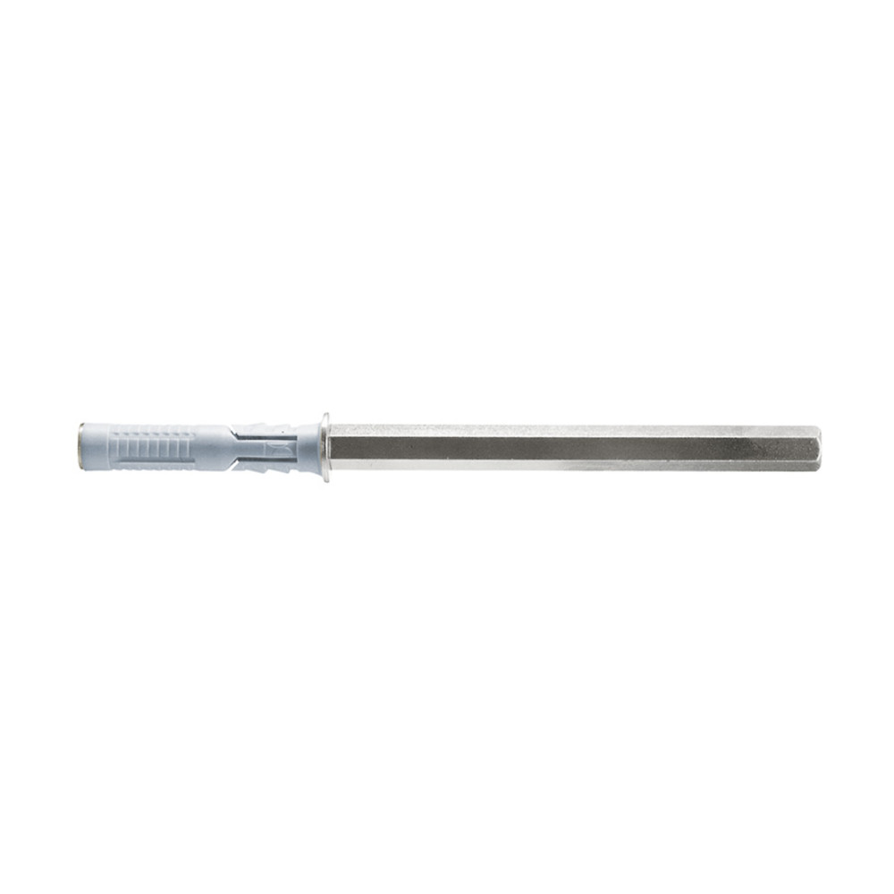 Il tassello è composto da due elementi principali, ovvero una barra in acciaio zincato che garantisce resistenza alla corrosione e lunga durata, e un tassello in nylon grigio, che assicura un ancoraggio stabile alla parete.