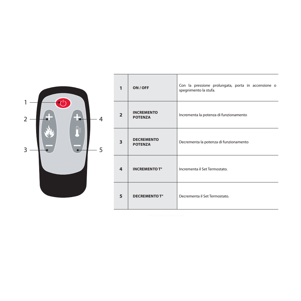 Il telecomando per stufe a pellet Extraflame ha ben 5 funzioni: accensione, spegnimento, regolazione temperatura ambiente e potenza.