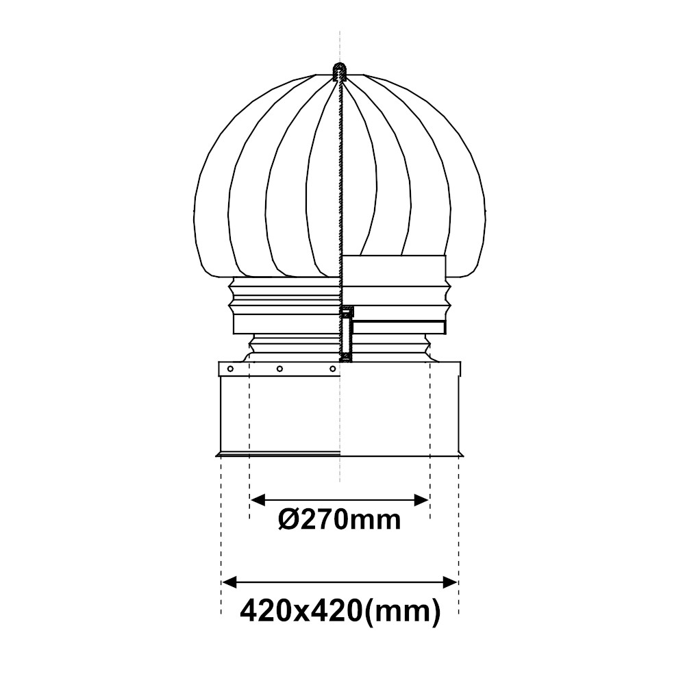 Cappello eolico in acciaio INOX Ø 270mm con base quadra da 420x420mm, facilita l’uscita dell’aria e dei fumi al di fuori della canna fumaria. Il tirafumo è la scelta ideale per la creazione di impianti di scarico di fumi derivanti da combustione di gas metano, gasolio o legna. Il terminale viene posto nella parte finale della canna fumaria e facilita l’uscita dei fumi di scarico. La rotazione eolica crea difatti una depressione che semplifica l’uscita dei fumi. Il fumaiolo ha una base quadrata da 420x420mm, ed un innesto con diametro di 270mm. In aggiunta è realizzato in acciaio inossidabile a parete singola. L’acciaio è un materiale eccellente per la realizzazione di circuiti di scarico di fumi. Infatti questo materiale è in grado di garantire un’elevata resistenza ed un’alta durabilità nel tempo. La scelta di utilizzare canne fumarie e raccordi in acciaio inox consente di ottimizzare la combustione e ridurre notevolmente sia i consumi che le sostanze inquinanti. Il cappello girevole in acciaio è perciò la scelta ideale per il vostro impianto di smaltimento fumi. Il cappello eolico è disponibile in vari diametri.