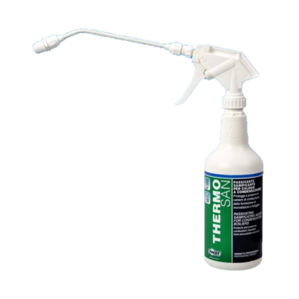 Thermosan è un passivante-sanificante studiato appositamente per la protezione delle camere di combustione in alluminio e alluminio-silicio delle caldaie a condensazione. Il prodotto va utilizzato solamente dopo aver eseguito il trattamento disincrostante con Thermoclean. Nebulizzare direttamente sulla superficie da trattare e lasciar agire per almeno 15 – 20 minuti. Infine lavare abbondantemente con acqua. Il prodotto, diluito in ragione del 5%, può anche essere impiegato per la pulizia e sanificazione di serbatoi, tubazioni, apparecchiature di processo nell’industria alimentare e nel trattamento delle acque industriali. Comodo flacone da 750 ml con erogatore. Facot Chemicals è una delle prime aziende italiane ad aver ottenuto la certificazione di prodotto sulla quasi totalità della gamma di produzione.