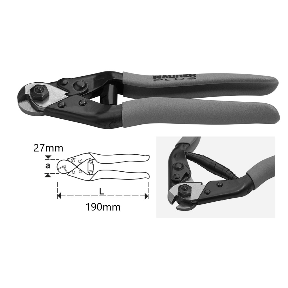 Tronchese per funi Maurer Plus. Testa realizzata in acciaio ad alta resistenza. Lunghezza 190 mm. Apertura massima 5 mm. Ideale per tagliare funi metalliche con diametro massimo 5 mm. Maurer ti propone un’offerta completa di prodotti per ogni tipo di lavorazione e riparazione. Per i lavori più impegnativi Maurer offre una linea di prodotti selezionata, dalla qualità superiore, capace di garantirti risultati sempre soddisfacenti. È Maurer Plus, il “fai da te” a livello professionale che risponde alle richieste degli artigiani e degli hobbisti più esigenti!