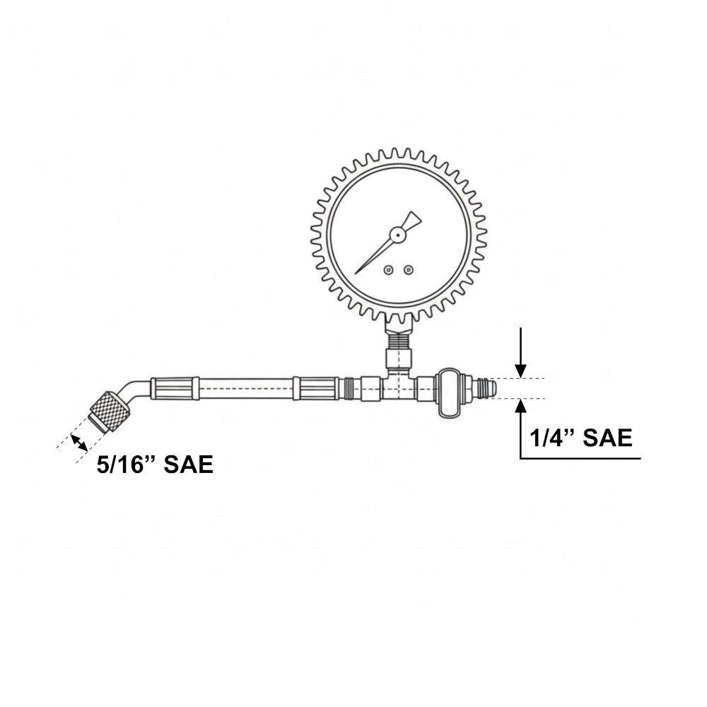 Il prodotto è composto da un tubo flessibile collegato a un manometro di controllo con quadrante a settori, studiato per facilitare la lettura in base ai diversi tipi di gas. È dotato di connessione 5/16” SAE femmina x 1/4” SAE maschio, che assicura la compatibilità con i principali kit azoto e strumenti di prova.