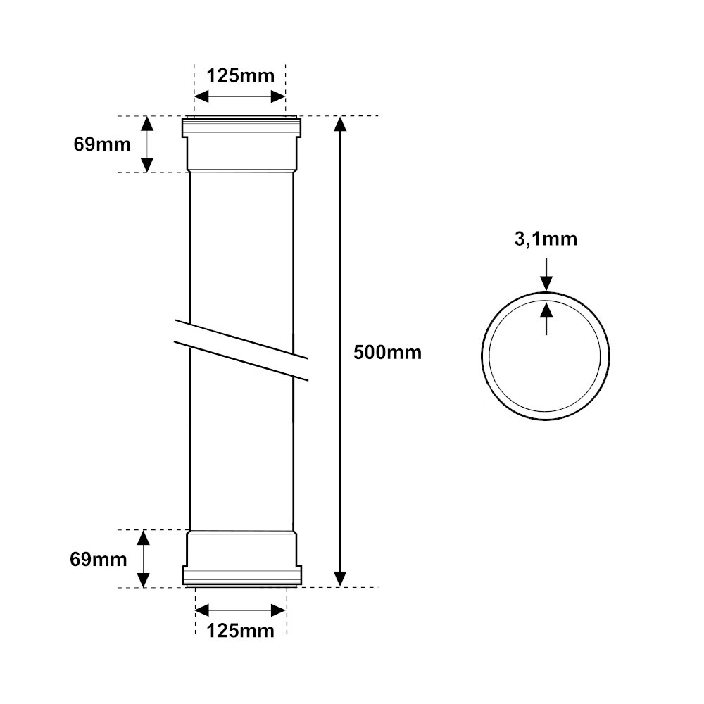 Il sistema in polipropilene grigio ad innesto è utilizzato per la realizzazione di impianti di scarico, drenaggio, ventilazione e trattamento di acque reflue. Il tubo ha una lunghezza di 500mm ed una struttura a 2 bicchieri. Inoltre il tubo possiede due attacchi femmina con diametro FF Ø125mm. Il raccordo sfrutta il sistema a bicchiere con guarnizione idraulica, il quale sistema garantisce una solida tenuta senza perdite. In aggiunta questo sistema previene le dilatazioni dovute alle variazioni della temperatura.