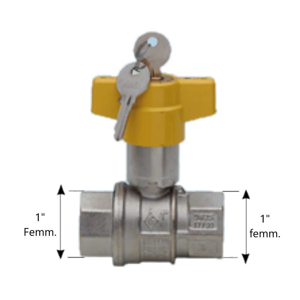 Saracinesca a sfera con serratura a passaggio totale con filetto femmina femmina a farfalla in alluminio. Rubinetto con serratura di sicurezza estraibile e sostituibile. Dispositivo di intercettazione di condotti gassosi in ottone. Il suo funzionamento si basa sulla rotazione della leva per 90°. Questa permette quindi la chiusura, l’apertura e la riduzione del flusso.