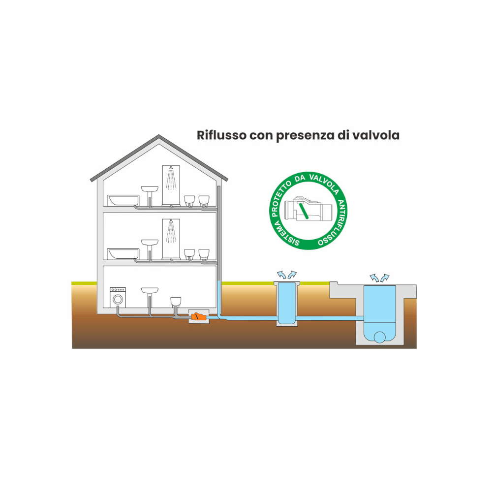 La valvola è dotata di un piattello in acciaio inox basculante, installato in direzione del flusso idrico di uscita, dal fabbricato verso la rete fognaria. In caso di riflusso, il piattello si chiude automaticamente a seguito della spinta dell’acqua di ritorno. Agendo manualmente sull’apposita leva, si può bloccare il piattello in modo meccanico e permanente. Il sistema si installa a monte del collettore principale in un apposito pozzetto accessibile ed ispezionabile. Oppure intercettando una tubazione sospesa in orizzontale sulla superficie inferiore di un solaio.