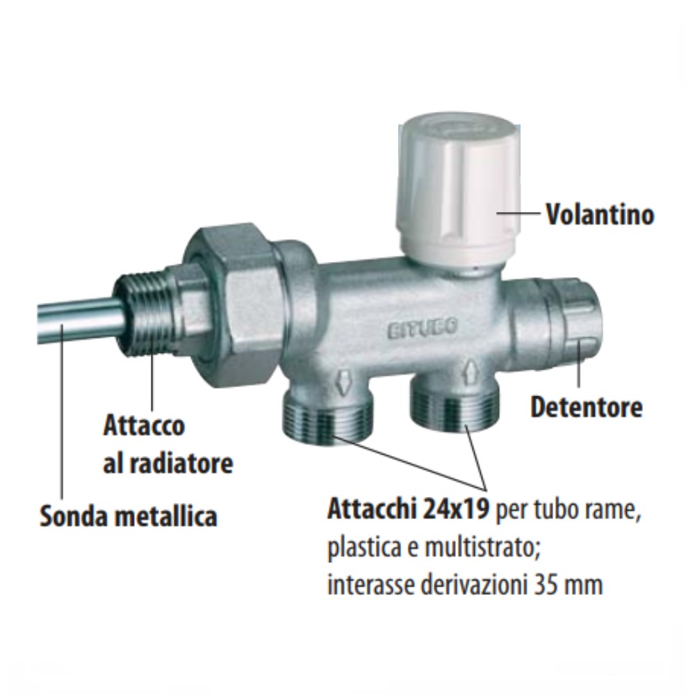 Per effettuare una chiusura del detentore è necessario utilizzare una chiave a brugola da 5 mm, la quale deve essere ruotata in senso orario fino a che non si arrivi ad una completa chiusura, cosi facendo da impedire la circolazione del fluido all’interno del radiatore. La valvola bitubo è realizzata in ottone cromato CB753S, con una manopola in ABS per l’apertura e chiusura del flusso al radiatore. Dotata di attacchi intercambiabili per tubo rame, plastica e multistrato, sonda metallica Ø 12 mm – 45 cm. La temperatura massima di esercizio è di 95°C. mentre la pressione massima di esercizio 10 bar. La gamma FAR è sinonimo di garanzia Made in Italy dei suoi prodotti.