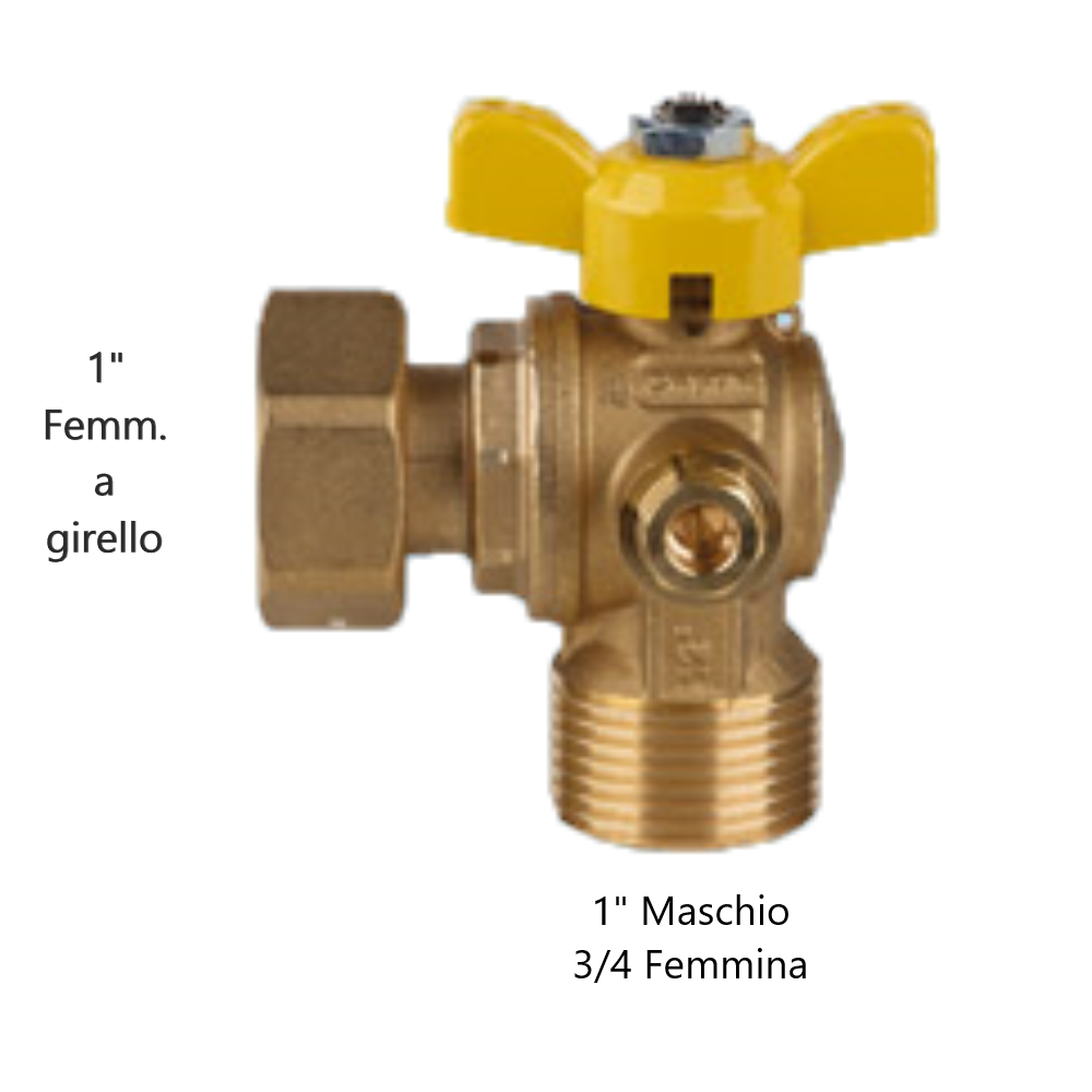 Saracinesca post contatore a squadro gas a passaggio totale con filetto maschio femmina. Valvola con presa di pressione di sicurezza. Attacco a girello da 1″ femmina e filetto doppio maschio da 1″ e femmina da 3/4. Dispositivo di intercettazione di condotti gassosi in ottone con serratura. Il suo funzionamento si basa sulla rotazione della leva per 90°. Questa permette quindi la chiusura, l’apertura e la riduzione del flusso.