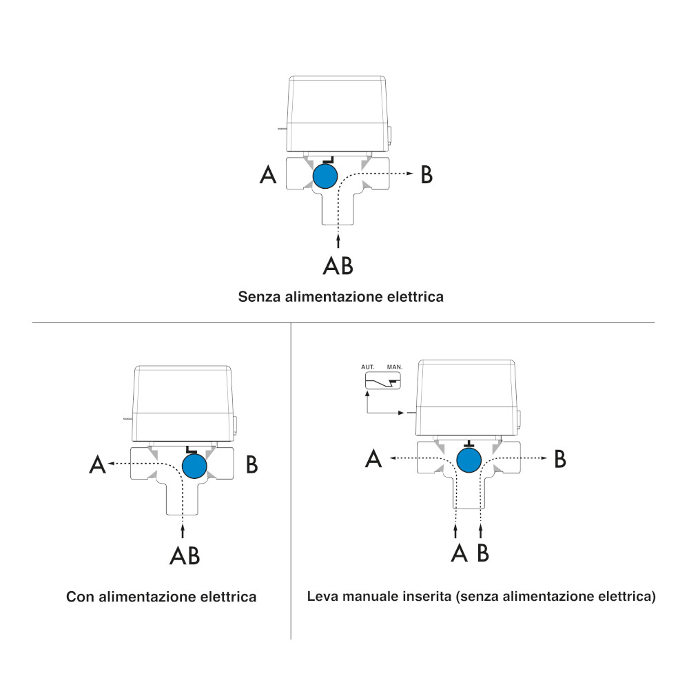 Valvola di zona motorizzata a 3 vie Ø 1″ F 230v – IP 22 con ritorno a molla. Le valvole di zona motorizzate serie SF vengono utilizzate in impianti di riscaldamento e condizionamento. Sono azionate da un motorino elettrico e possono assumere due posizioni di funzionamento a seconda che quest’ultimo sia attivato o no. Senza alimentazione elettrica la valvola posiziona la via A chiusa e la via B aperta. L’otturatore a sfera chiude la via A sotto l’azione della forza elastica esercitata dalle molle di ritorno. Quando viene attivata l’alimentazione elettrica il servomotore vince la forza delle molle e sposta la sfera dalla via A alla via B in circa 20 secondi e la mantiene in quella posizione sino a quando non si toglie l’alimentazione. Quando si toglie l’alimentazione elettrica le molle di ritorno riportano l’otturatore sulla via A.