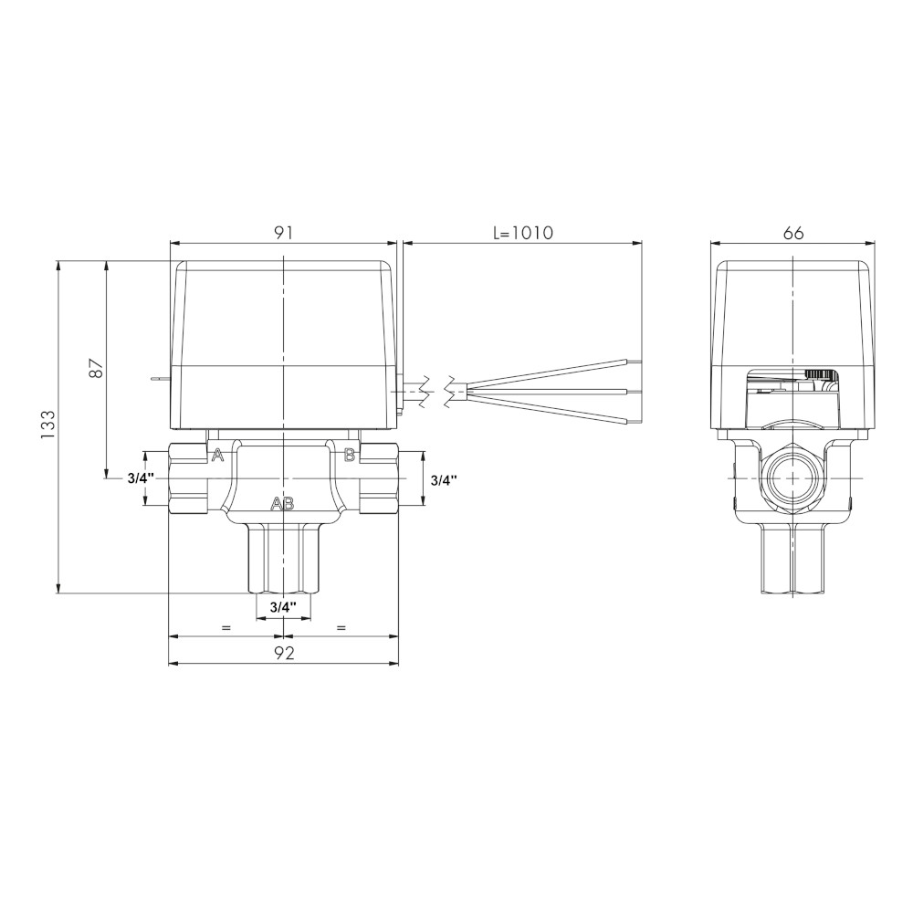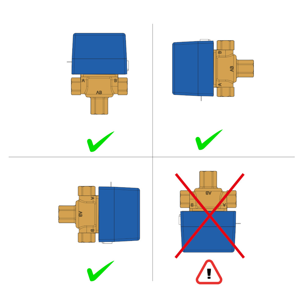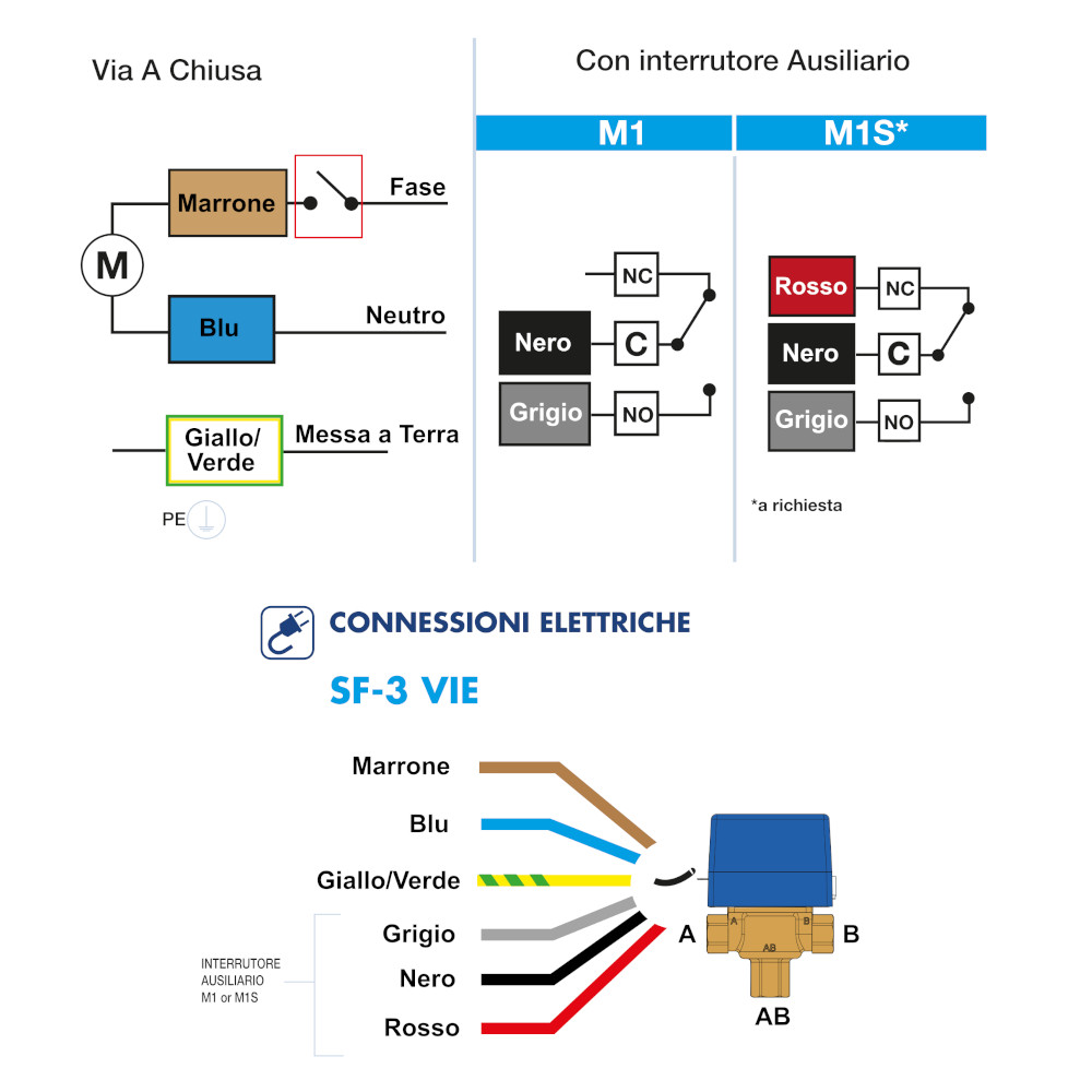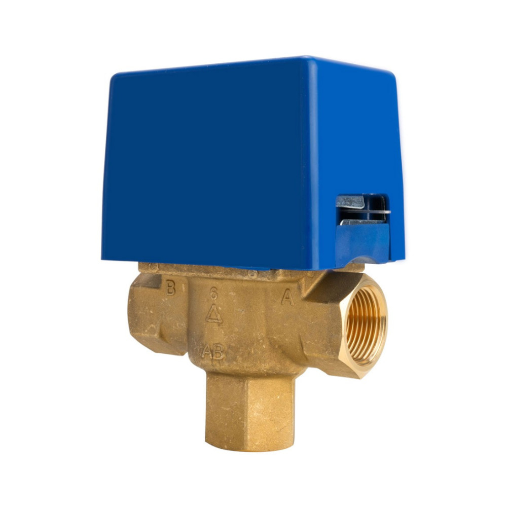 Valvola di zona motorizzata a 3 vie Ø 3/4″ F 230v – IP 22 con ritorno a molla. Le valvole di zona motorizzate serie SF vengono utilizzate in impianti di riscaldamento e condizionamento. Sono azionate da un motorino elettrico e possono assumere due posizioni di funzionamento a seconda che quest’ultimo sia attivato o no. Senza alimentazione elettrica la valvola posiziona la via A chiusa e la via B aperta. L’otturatore a sfera chiude la via A sotto l’azione della forza elastica esercitata dalle molle di ritorno. Quando viene attivata l’alimentazione elettrica il servomotore vince la forza delle molle e sposta la sfera dalla via A alla via B in circa 20 secondi e la mantiene in quella posizione sino a quando non si toglie l’alimentazione. Quando si toglie l’alimentazione elettrica le molle di ritorno riportano l’otturatore sulla via A.