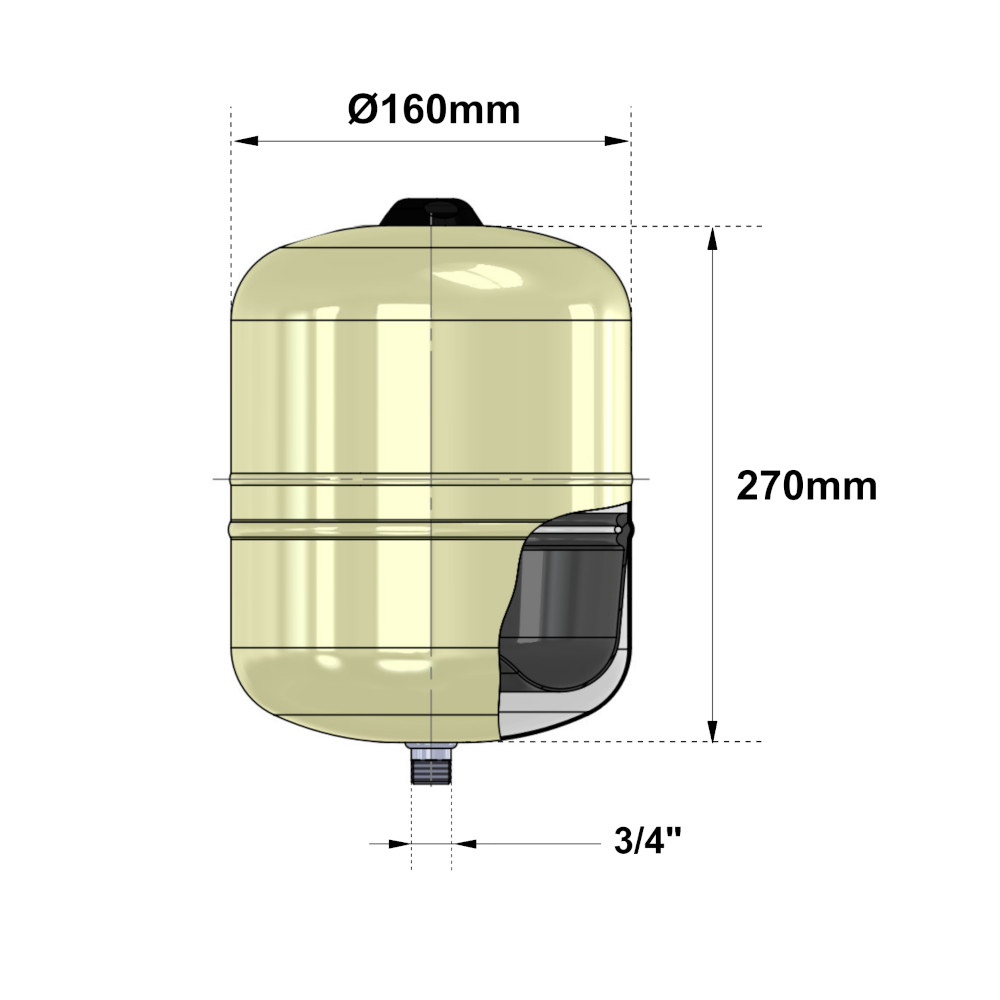 Il vaso Hydro-Plus da 5 litri ha una forma cilindrica allungata ed evita qualsiasi ristagno di acqua e di conseguenza la crescita batteriologica. Il rivestimento esterno con vernice a polvere epossi-poliestere garantisce una lunga durata ed una protezione ottimale contro gli agenti atmosferici. Le saldature in MIG eliminano qualsiasi spigolo o forma tagliente all’interno del serbatoio. La membrana, progettata in butile, contribuisce ad eliminare eventuali sedimenti e la proliferazione di batteri mantenendo l’acqua pulita e sicura. Il sistema è fornito di un raccordo da 3/4″ G in acciaio inox, per una massima resistenza contro la corrosione e di una valvola di precarica con protezione da 2,5bar. Inoltre, è adatto ad essere usato con bollitori elettropompe e come anticolpo d’ariete. La temperatura massima del sistema è di 10°C/ +99°C e la pressione massima di 10bar.