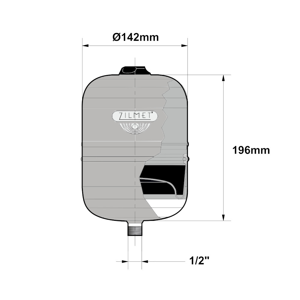 Il vaso Hydro-Pro Zilmet è precaricato e controllato in fabbrica ed è un prodotto Made in Italy. Hydro-Pro 2 ha una capacità di 2 litri, un pressione massima di esercizio di 10 bar, una pressione precarica di 3,5 bar e una temperatura di esercizio minima/massima di 10°C/99°C. Inoltre ha un diametro di Ø142mm, altezza di 196mm e raccordo 1/2″ G. Per ulteriori informazioni tecniche in merito al vaso Hydro-Pro, consultare la scheda tecnica in allegato.