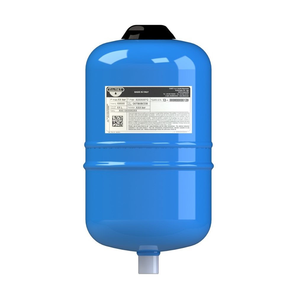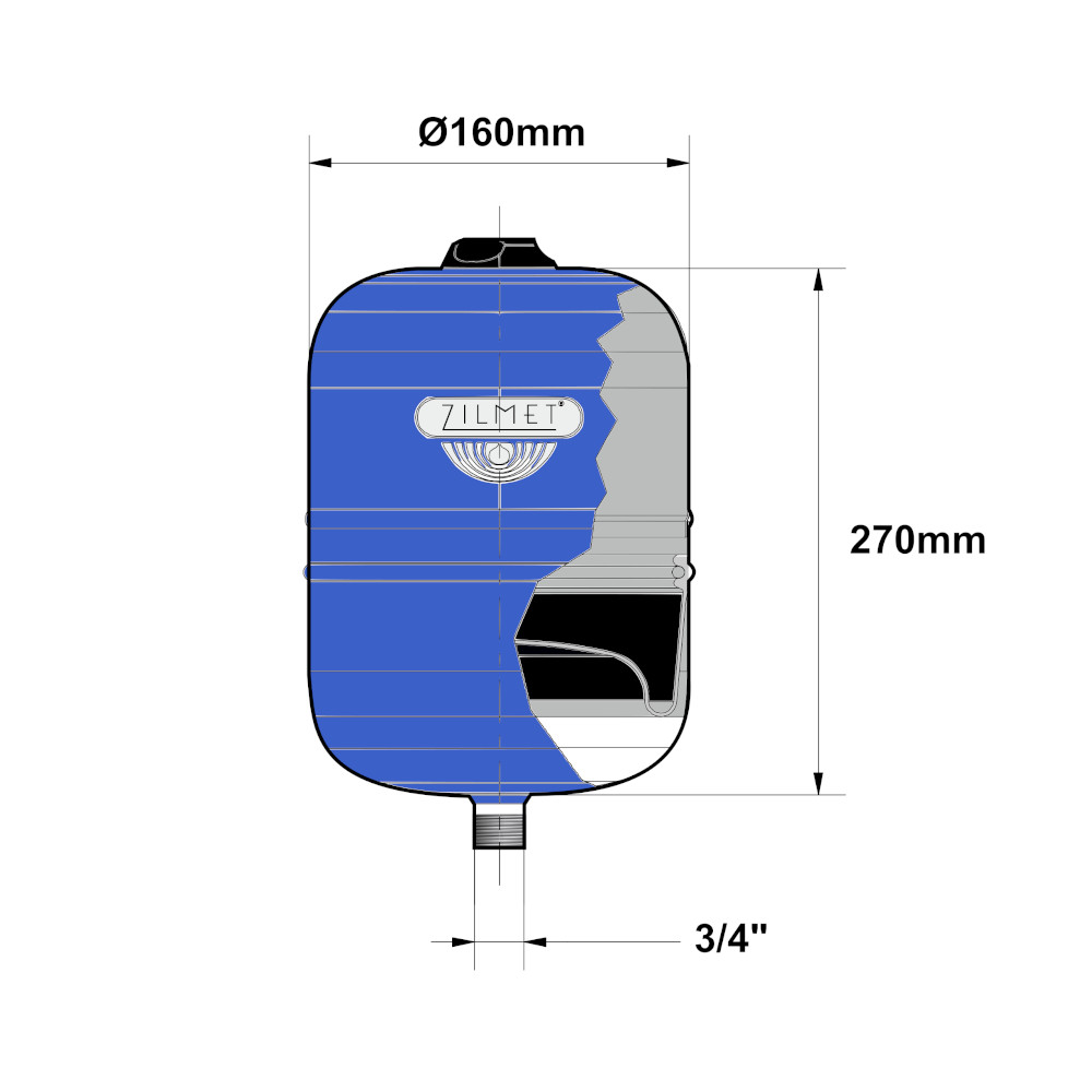 Il vaso Hydro-Pro Zilmet è precaricato e controllato in fabbrica ed è un prodotto Made in Italy. Hydro-Pro 5 litri ha una capacità di 5 litri, una pressione massima di esercizio di 10 bar, una pressione precarica di 3 bar e una temperatura di esercizio minima/massima di 10°C/99°C. Inoltre ha un diametro di Ø160mm, altezza di 270mm e raccordo di 3/4″G. Per ulteriori informazioni in merito al vaso Hydro Pro, consultare la scheda tecnica in allegato.