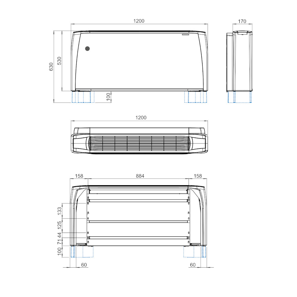 Il ventilconvettore ha la possibilità di essere installato in posizione verticale a parete, o in orizzontale a soffitto. Il ventilconvettore ha una sezione frontale realizzata in lamiera d’acciaio zincata a caldo, ed è preverniciata di colore bianco RAL 9003. Presenta due spalle robuste in ABS, con struttura robusta e durevole nel tempo. La griglia superiore (versione MV) è reversibile ed ha due alette fisse. La struttura interna è realizzata in lamiera zincata. Il filtro è realizzato in polipropilene, risultando facilmente lavabile ed è semplice da estrarre. Il motore è montato su supporti elastici antivibranti. La batteria di scambio termico è realizzata in rame ed in alluminio. Inoltre è reversibile, per cui il lato degli attacchi può essere invertito durante l’installazione, garantendo una grande versatilità di montaggio.