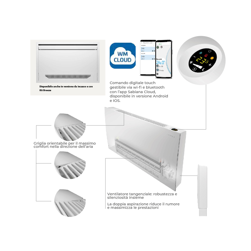 La sua tecnologia Wifi permette di controllare il dispositivo da remoto, per un elemento versatile, anche quando non si è in casa. In aggiunta grazie alla presenza di motori e di tecnologie avanzate, il Carisma Whisper permette di un notevole risparmio energetico, riducendo consumi, ma garantendo allo stesso tempo ottime proprietà di riscaldamento e di raffrescamento. In questa versione MV il ventilconvettore Sabiana ha la possibilità di essere montato sia a parete che a pavimento, usufruendo di piedini opzionali di 10cm. Il mobile di copertura del ventilconvettore è di colore bianco RAL 9003. Inoltre presenta una sezione frontale, realizzata in lamiera d’acciaio plastificata.