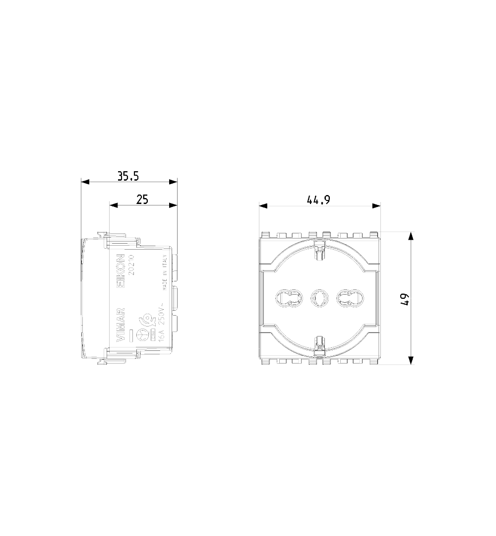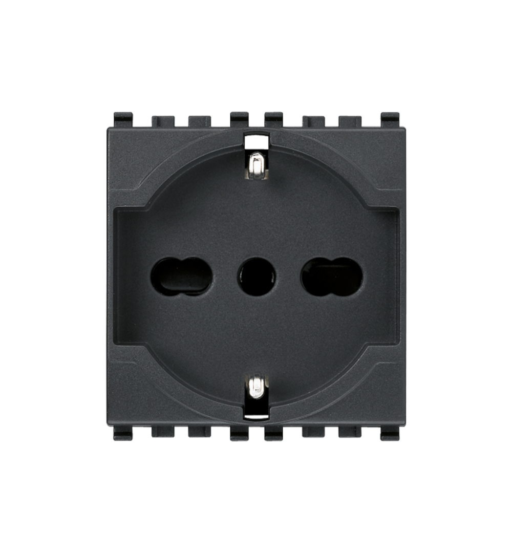 La presa 2P+T 16A Universale è un dispositivo universale standard italiano IP40, utilizzato per la commutazione elettrodomestici, garantendo la massima compatibilità con vari elettrodomestici e dispositivi. Presenta 2 poli più messa a terra. E’ possible inserire la presa tedesca schuko, oltre alla presa standard italiana. La presa è progettata con materiale termoplastico, il quale vanta un’elevata resistenza e garantisce una lunga durata nel tempo. Le sue caratteristiche principali sono gli alveoli elastici avvolgenti e la priorità di contatto su alveoli o contatti a terra. La sua installazione prevede un montaggio ad incasso. Inoltre è conforme alla normativa CEI 23-50 (IEC 60884-1). Corrente nominale di 16A. Tensione Nominale 250 V. Frequenza 50,00-60,00 HZ. Per maggiori informazioni in merito alla presa 2P+T 16A Universale Eikon Vimar, consultare il documento in allegato.