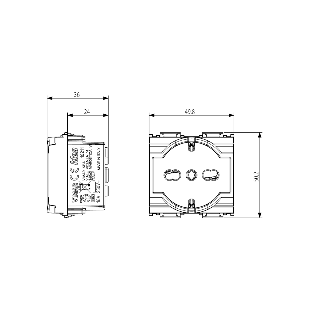 L’apparecchio universale Vimar presenta due moduli da frutto, ha una tensione nominale di 250 V, una corrente nominale di 16 A e una frequenza di 50,00-60,00 HZ. La presa Idea Vimar ha un’altezza di 50mm, larghezza di 49mm e profondità di 36mm.