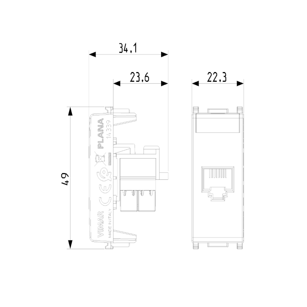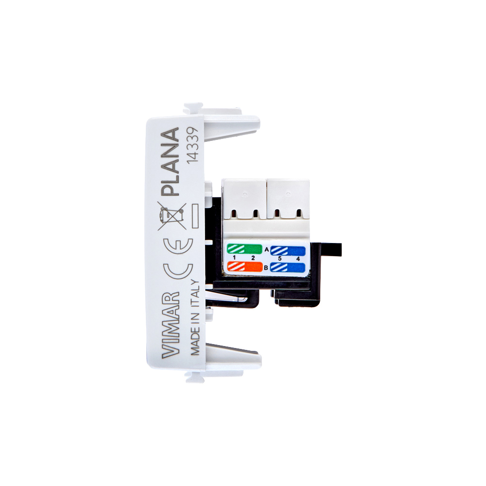 Vimar Plana Presa RJ45 è una presa che è utilizzata per il cablaggio universale T568A/B di reti ethernet. Le rete ethernet è un insieme di strumenti di rete, la quale permette la creazione di reti locali estremamente estese. La presa Vimar Plana è costituita da un connettore Netsafe Cat5 e Utp ed è privo di schermatura. Il Netsafe è un sistema di cablaggio strutturato per un impianto evoluto e multiservizio.