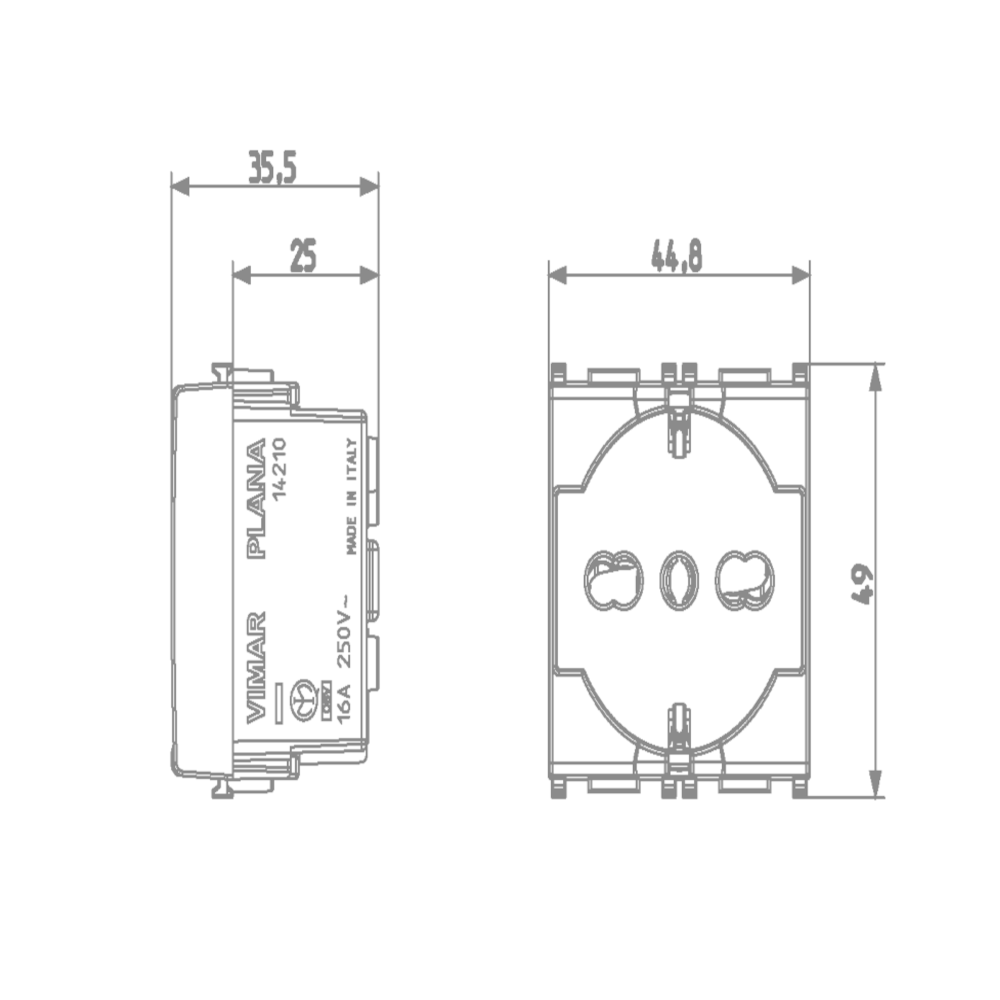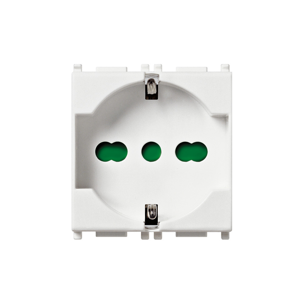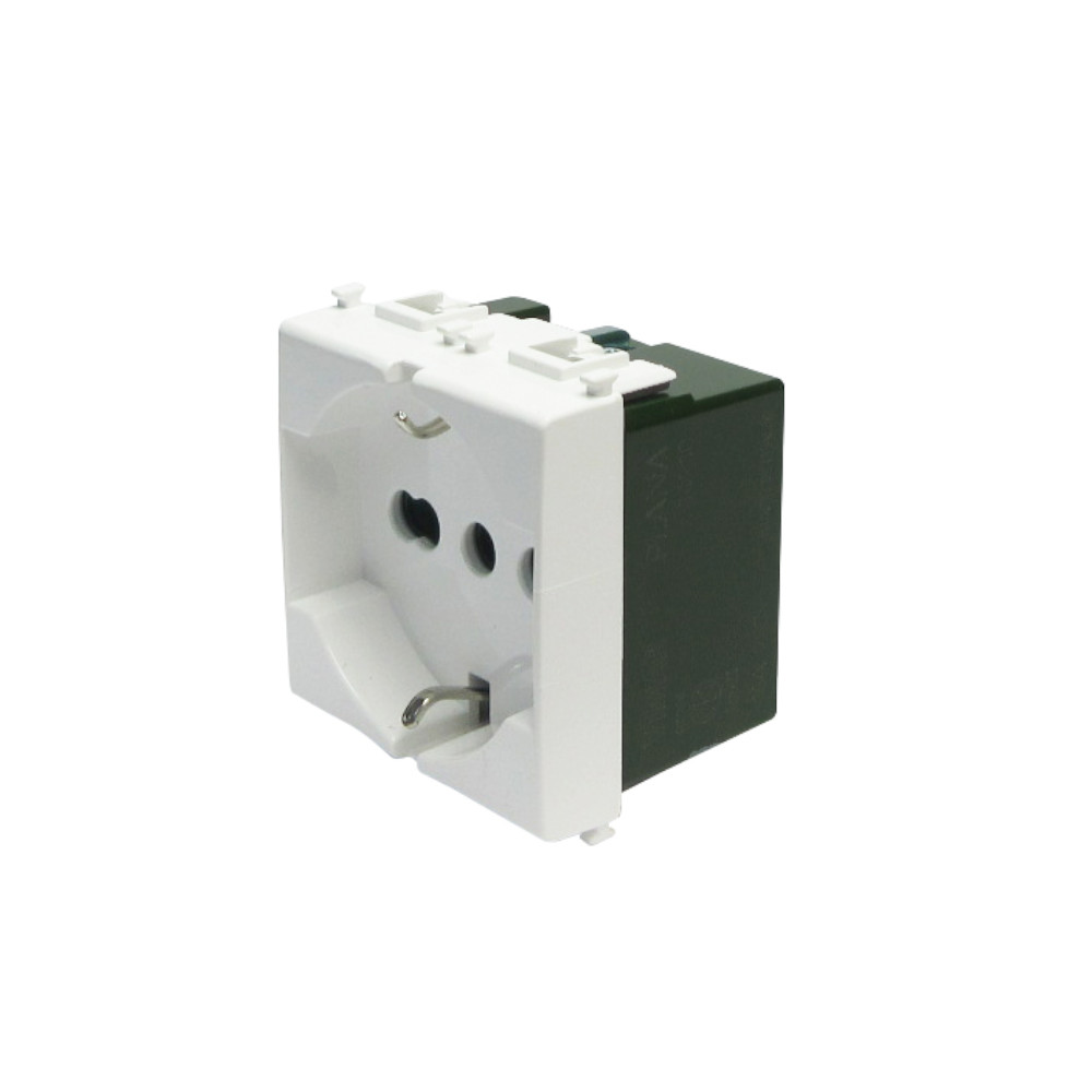 Presa Vimar Plana universale, ha la possibilità di far inserire spine schuko, spine da 10A piccole, spine 16A grandi; utilizzata per collegare alla rete la maggior parte di elettrodomestici e spine di ogni tipo. La presa Vimar Plana universale è una presa sicury standard italiano tipo P40 a 2 moduli. La sua semplice installazione richiede di un fissaggio ad incasso con collegamento un montaggio morsetto a vite. Adatto a classe di protezione IP20. La presa Vimar Plana presenta una struttura in plastica di colore bianco e superficie lucida.