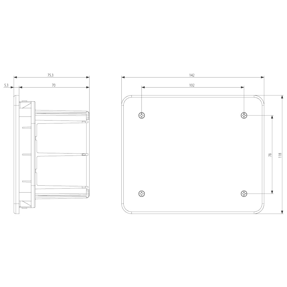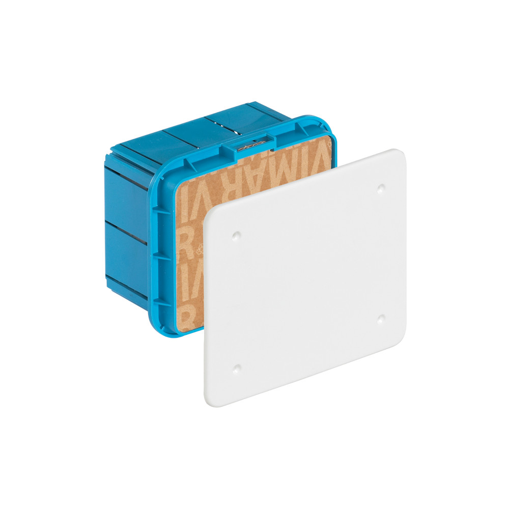 Scatola di derivazione da incasso con coperchio bianco e viti di fissaggio. Le cassette vengono utilizzate per effettuare i collegamenti elettrici di un impianto. Inoltre distribuiscono i conduttori in punti distinti fino all’utilizzatore.