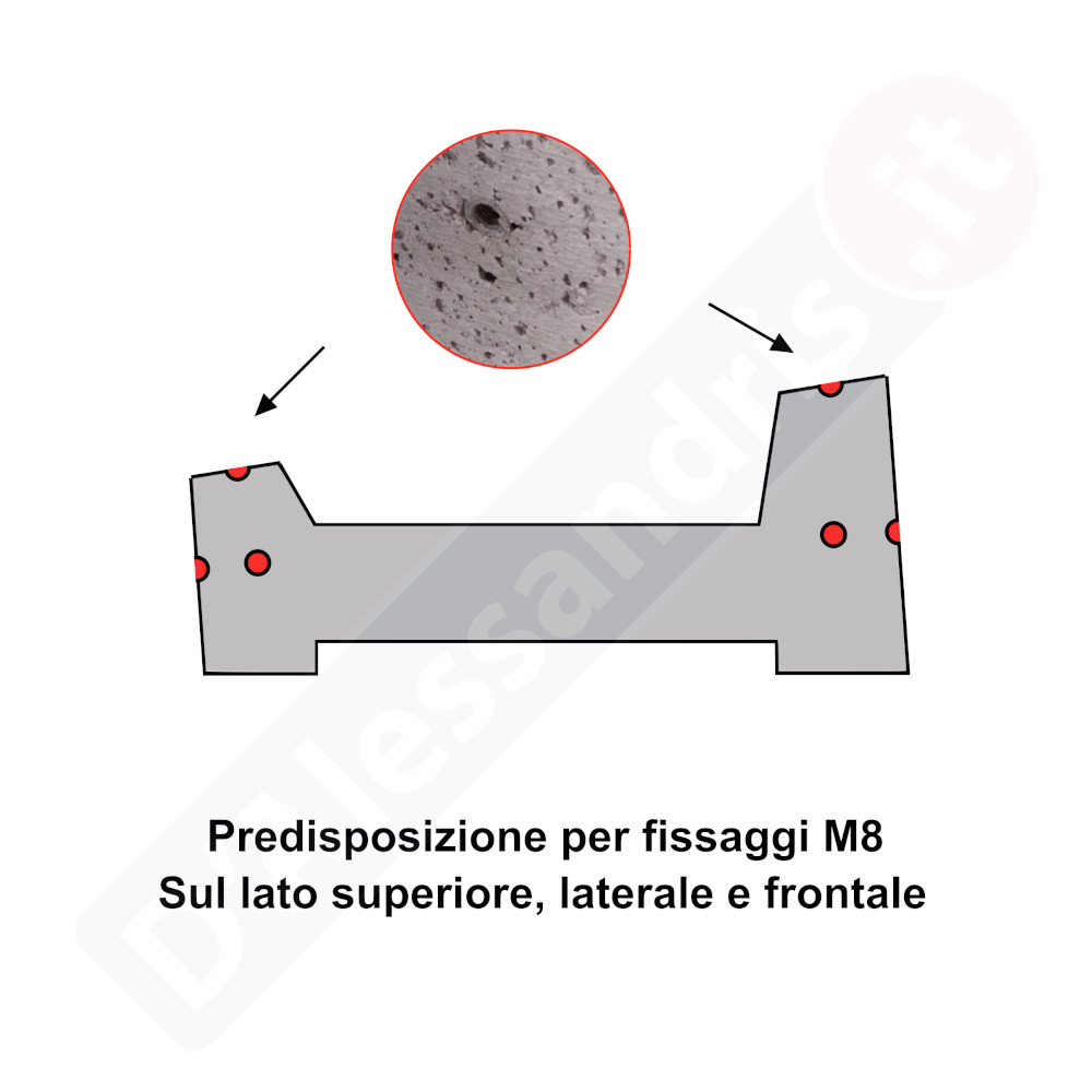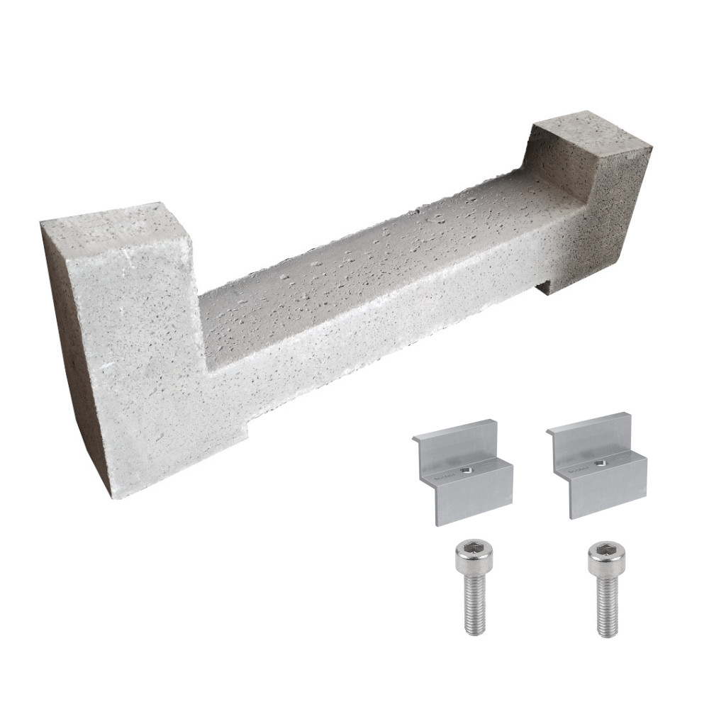 La dotazione comprende due morsetti finali in alluminio M F 30, fondamentali per fissare saldamente i pannelli alla struttura di supporto, garantendo una connessione robusta e durevole nel tempo. Inoltre sono inclusi due bulloni M8x35 in acciaio A2 DIN912 con esagono scavato, ideali per un serraggio preciso e stabile, facilitando l’installazione anche in spazi ridotti o difficili da raggiungere. La zavorra, progettata per garantire una massima stabilità ai pannelli fotovoltaici, previene eventuali spostamenti o sollevamenti che potrebbero compromettere le prestazioni dell’impianto.